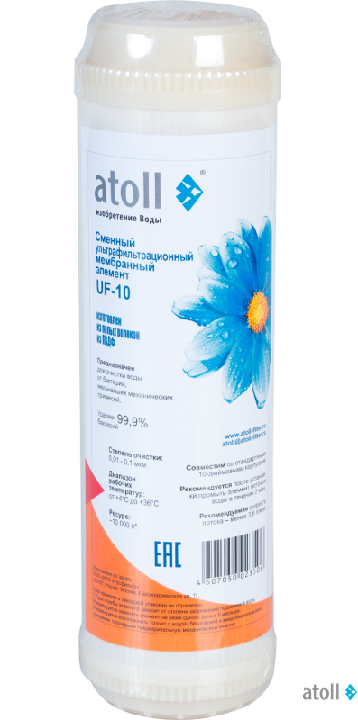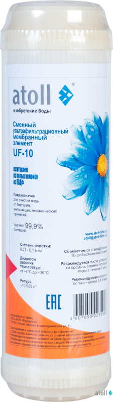 Картридж atoll серии UF типоразмера Slim Line cпециальный ультрафильтрационный для обеззараживания воды. Изготовлен из гидрофильного полимерного материала с размером пор 0,01-0,1 мкм и удаляет до 99,9% бактерий и простейших.