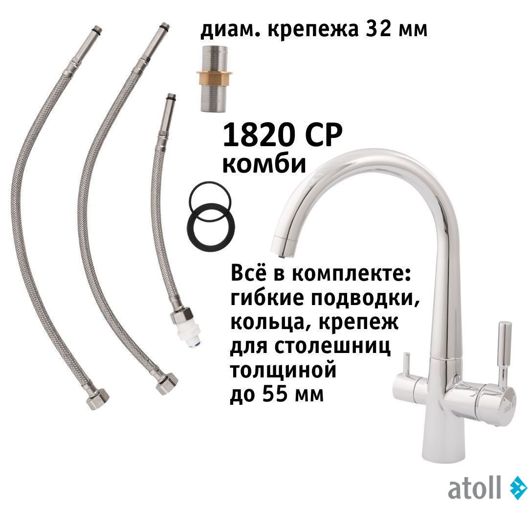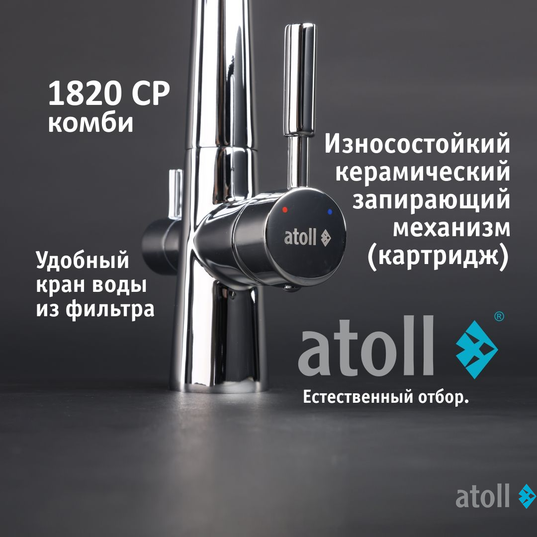 Кран комбинированный (хол/гор + питьевая) atoll 1820-CP (хром) - утонченная многофункциональная модель для ежедневного использования в современной кухне. Подключается к фильтру и служит для подачи как очищенной воды из фильтра, так и холодной/горячей воды из водопровода. Комбинированный кран имеет в себе два различных канала, что исключает смешивание потоков водопроводной воды и воды прошедшей фильтрацию.