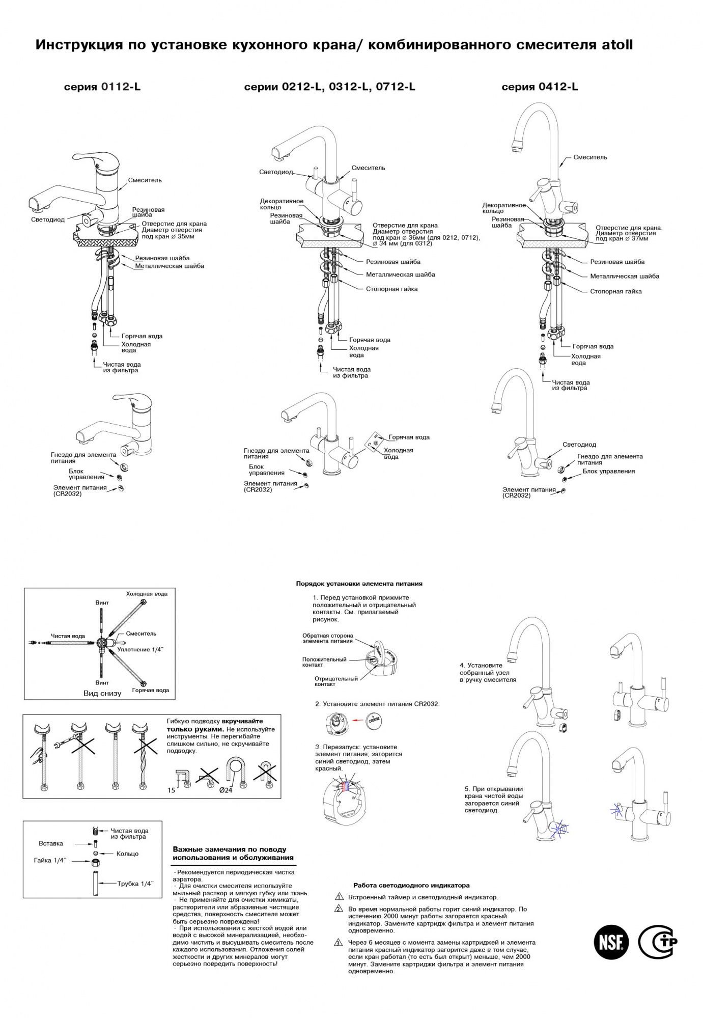 В Комбинированных кранах atoll с LED - лампочкой, встроен светодиодный индикатор с таймером, который своевременно напомнит о необходимости замены картриджей в фильтре - изменением своего цвета с голубого на красный.