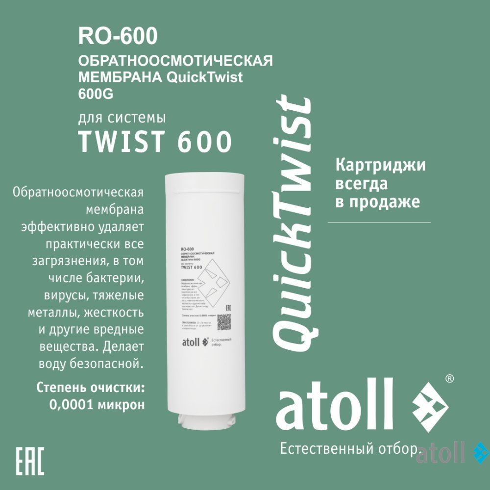 Мембрана обратноосмотическая atoll TWIST RO-600 для системы обратного осмоса atoll TWIST 600.