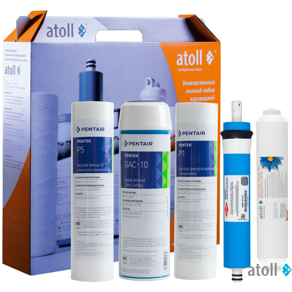 Набор предназначен для использования входящих в его комплект картриджей для периодической замены использованных элементов в системах обратного осмоса торговой марки atoll. Все сменные фильтрующие элементы, входящие в этот набор, имеют стандартные типоразмеры, и могут быть использованы для большинства фильтров других производителей.