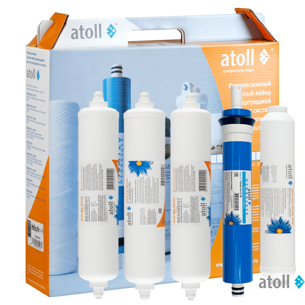 Набор предназначен для использования входящих в его комплект картриджей для периодической замены использованных элементов в системах обратного осмоса торговой марки atoll. Все сменные фильтрующие элементы, входящие в этот набор, имеют стандартные типоразмеры, и могут быть использованы для большинства фильтров других производителей.