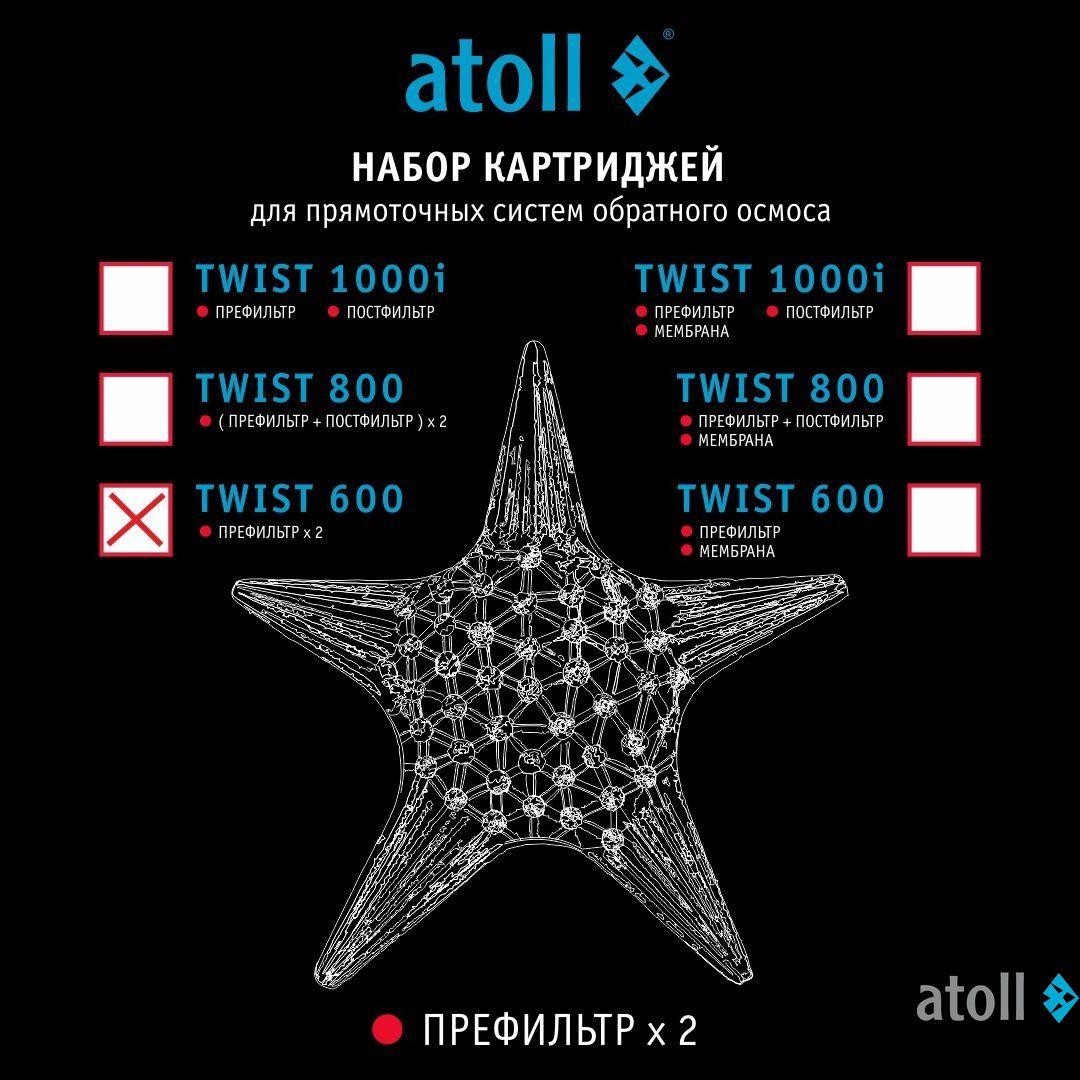 Набор картриджей для atoll TWIST 600 (префильтр; мембрана). Покупка картриджей в наборе — экономит средства, т. к. цена на картриджи в комплекте набора интереснее, чем на картриджи по отдельности!