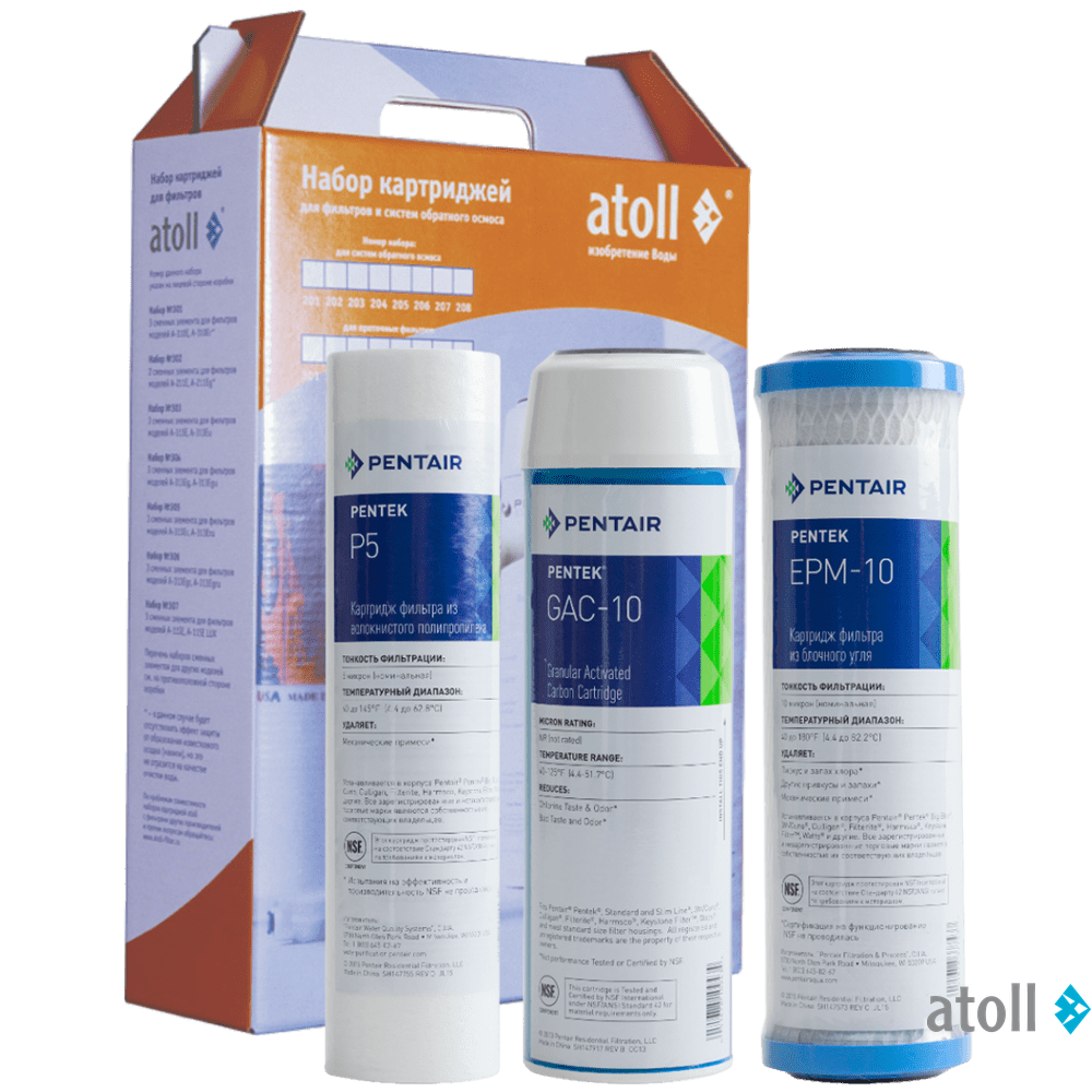Набор картриджей Atoll №203 STD предназначен для замены использованных элементов в системах обратного осмоса - A-550E, A-560, A-560Е, A560Em, A-560Ecp, A-575, A-575E, A-575Em, A-575Ecp (для сильно хлорированной воды, удаление запаха хлора) Содержит три предфильтра.