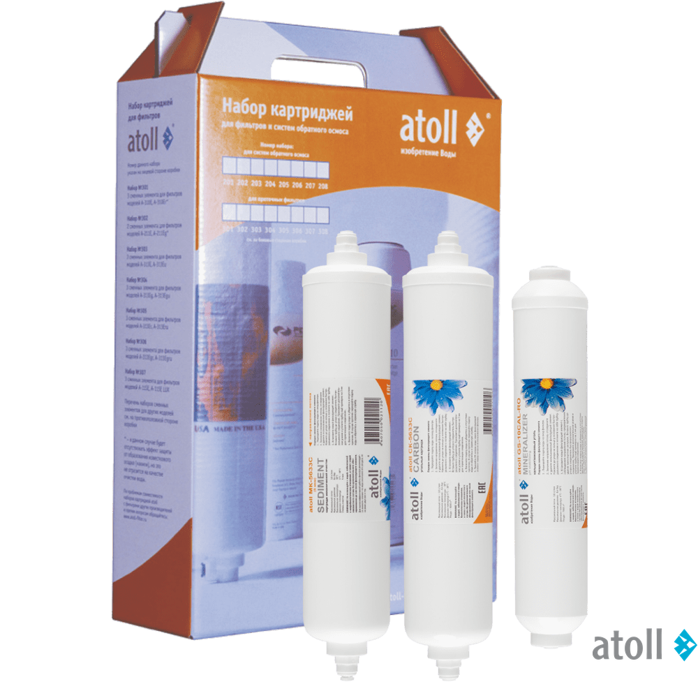 Набор картриджей Atoll №206m STDA предназначен для замены использованных элементов в системах обратного осмоса. Содержит предфильтры и постфильтр.