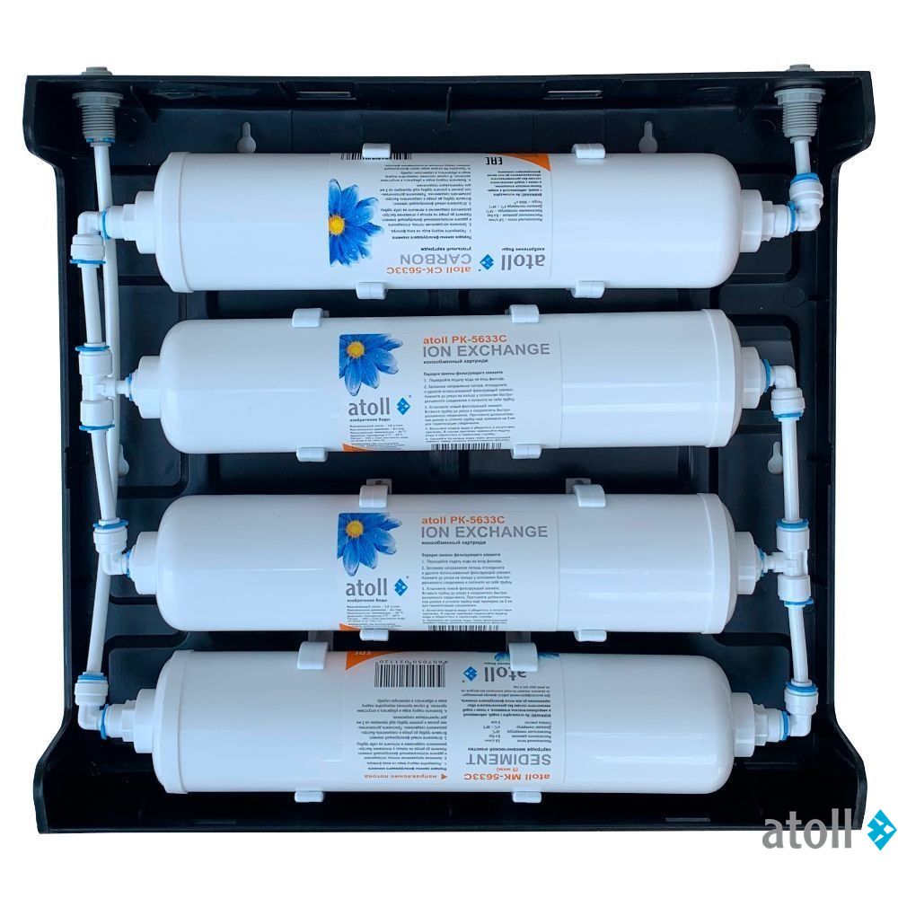 Проточный питьевой фильтр atoll Slim D-40s - четыре ступени очистки эффективно удаляют механические загрязнения, хлор и его соединения, умягчают воду. Благодаря двойной ступени умягчения ресурс по этому параметру увеличен вдвое.