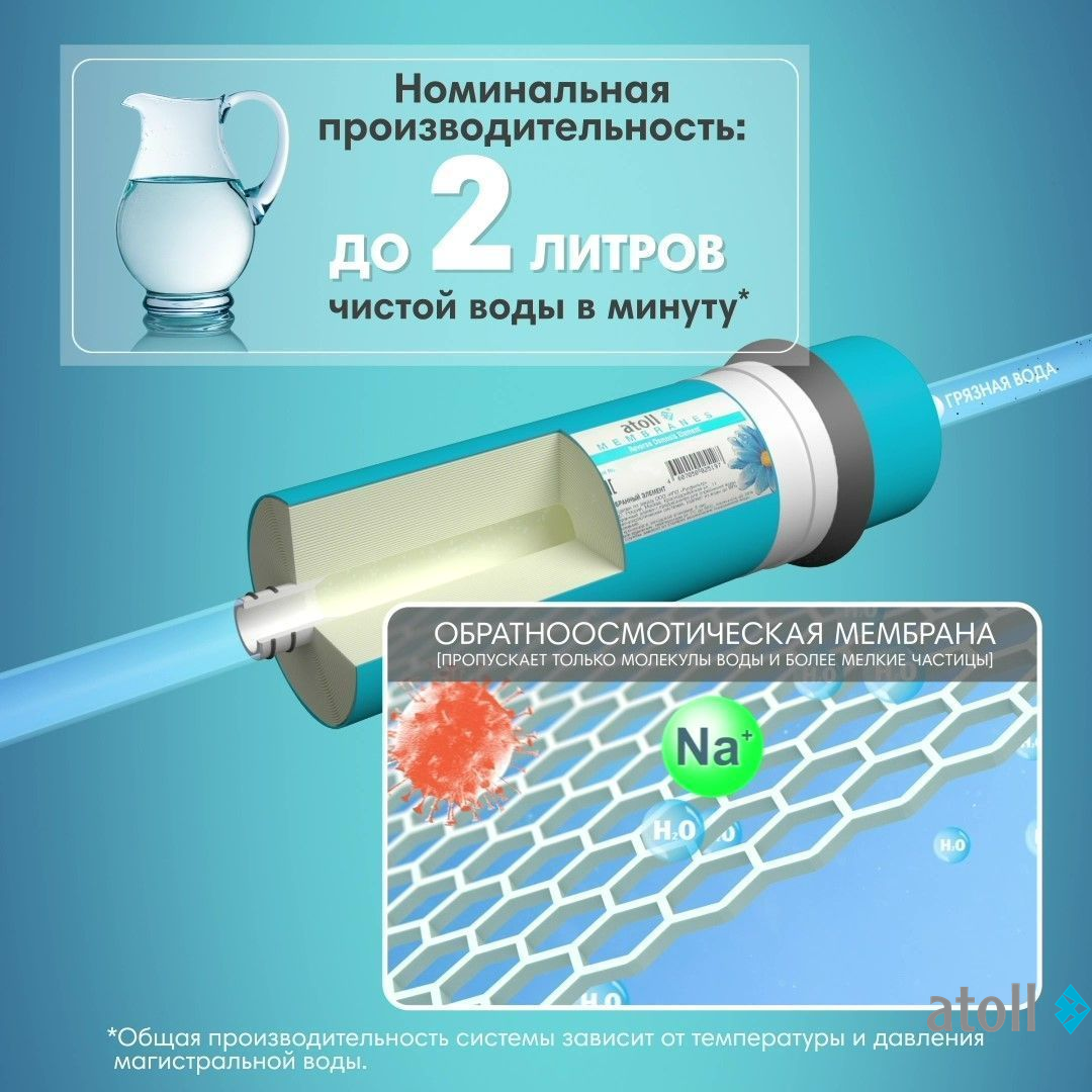 Ном. производительность: до 2.0 литров в минуту при давлении (от 3 до 6 атм) - мультиэкологичность – система не требует подключения к электричеству. Система работает бесшумно – никого не разбудите ночью. Система сливает в дренаж в 2 раза меньше воды по сравнению с классическими осмосами. Исключается застой воды в накопительном баке по причине его отсутствия.