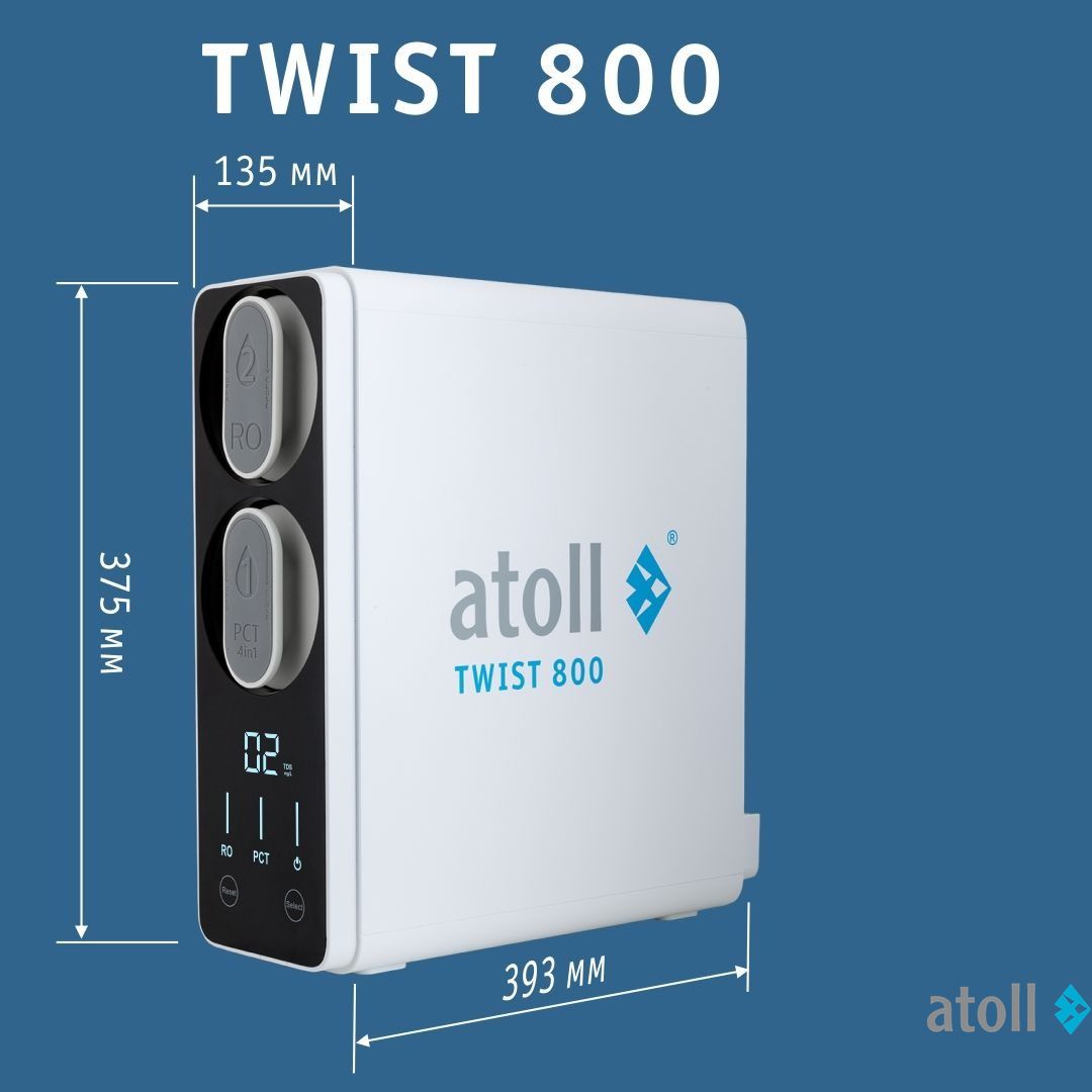 Сверхмощная обратноосмотическая мембрана atoll 800 TWIST производит в минуту более 2-х литров чистой питьевой воды.