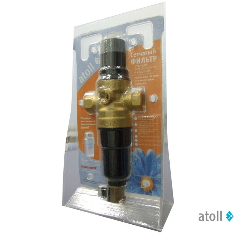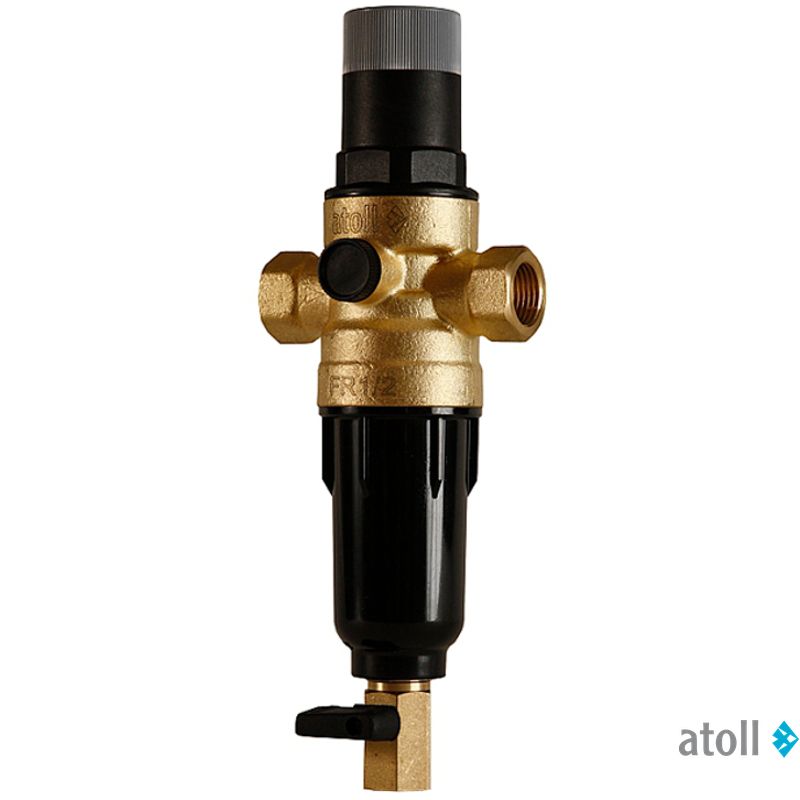 Комбинированный сетчатый фильтр atoll FK06-1/2B (черная пластиковая колба для гор. и хол. воды) с редукционным клапаном в прозрачной блистерной упаковке - предназначен для очистки воды от песка, ила, ржавчины и т.п.