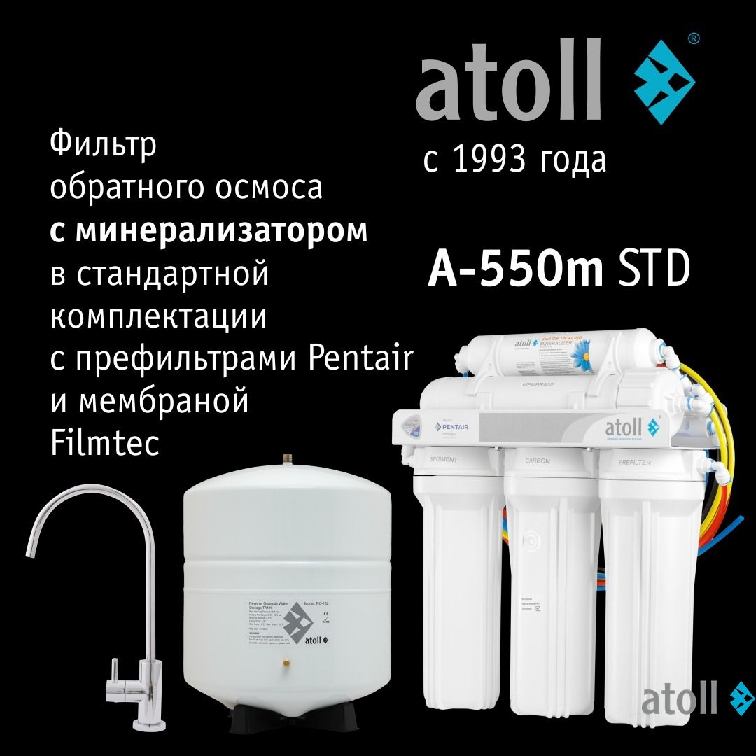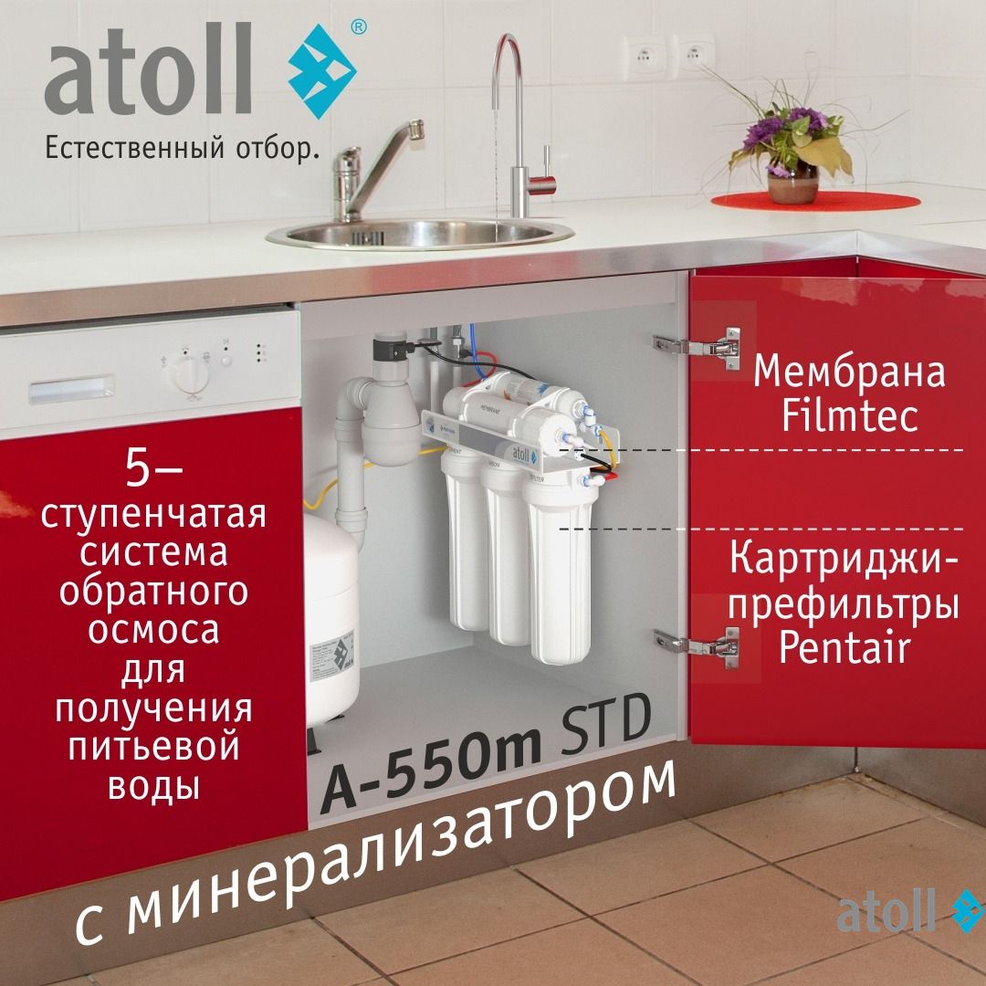 Atoll A-550m STD — это обратноосмотическая система очистки питьевой воды с минерализатором. Процесс фильтрации на основе полупроницаемой полиамидной тонкопленочной мембраны исключает применение химических веществ.