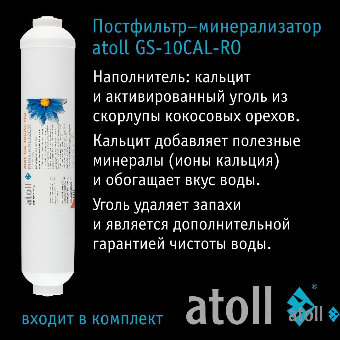 • минерализатором atoll GS-10CAL/RO — постфильтрация. Дополнительная очистка фильтром на основе гранулированного кокосового активированного угля, обогащенного кальцитом.