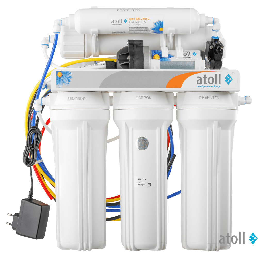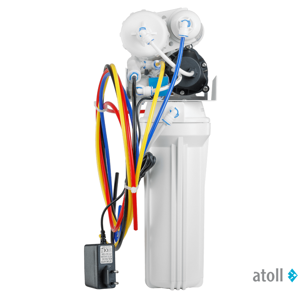 Фильтр на основе обратного осмоса Atoll A-550p STDA дополнительно укомплектован насосом повышения давления. Предназначен для доочистки воды в водных магистралях, где давление нестабильно или не превышает 2,8 бар. Представляет собой систему, которая удаляет до 99,9% всех примесей содержащихся в воде и предотвращает образование накипи в нагревательных приборах. Фильтрация осуществляется за счет прохождения воды под напором через полупроницаемую мембрану, которая пропускает только молекулы воды и кислорода.