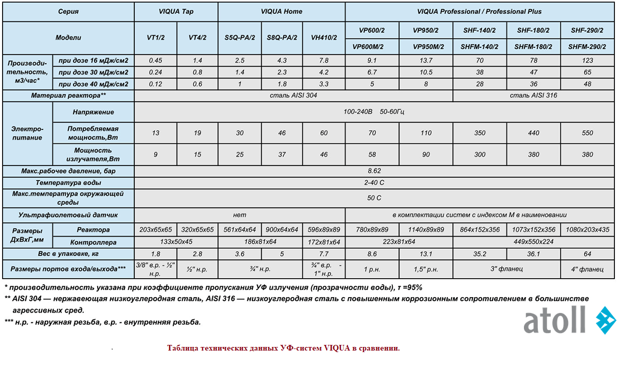 УФ стерилизатор VIQUA VT1/2 нейтрализует все известные болезнетворные микроорганизмы с большим запасом надежности. Кишечная палочка, бацилла дизентерии, возбудители холеры и тифа, вирусы гепатита и гриппа, сальмонелла, цисты Giardia lamblia и Cryptosporidium погибают при дозе облучения менее 10 мДж/см². Стерилизатор VIQUA, при заданной производительности, обеспечивает дозу облучения не менее 16 мДж/см².